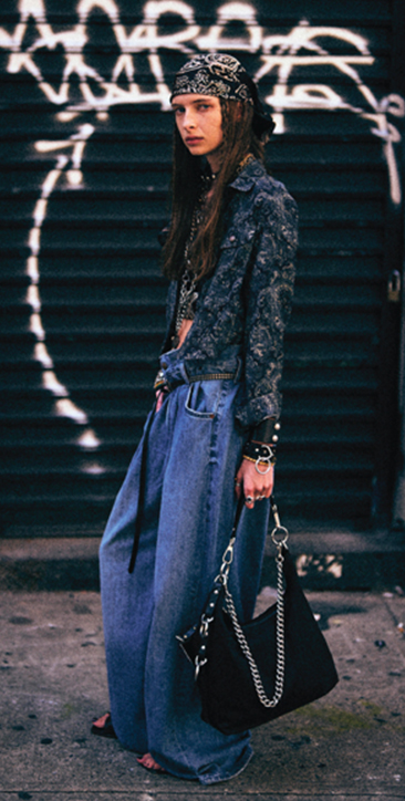 El jean de pierna ancha sigue marcando la pauta en siluetas, destacando por sus formas relajadas y voluminosas. Su renovación surge en los detalles utilitarios, los acabados de inspiración workwear y el estilo de clásicos reinterpretados.