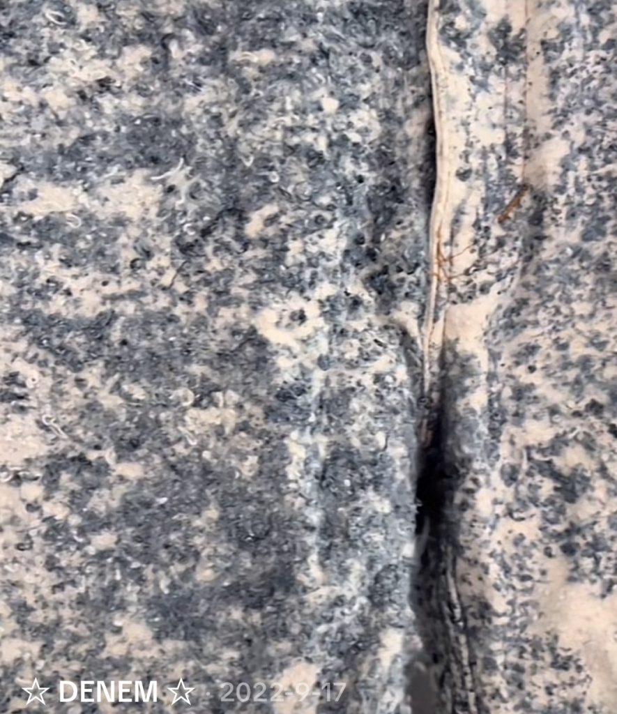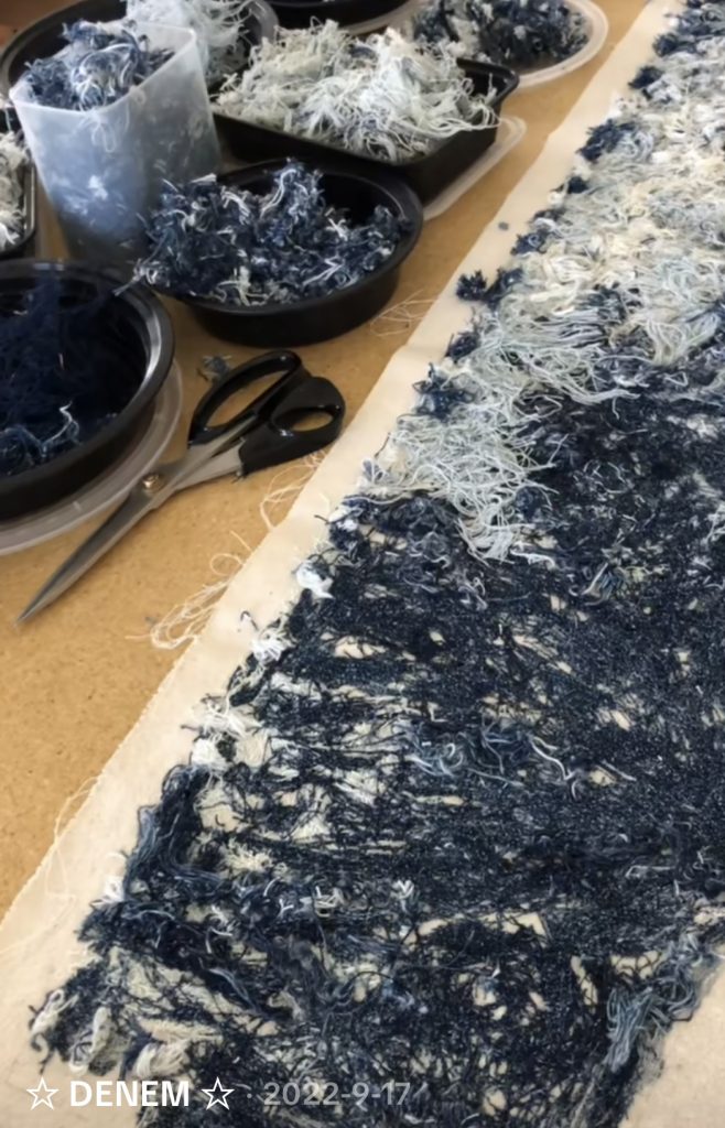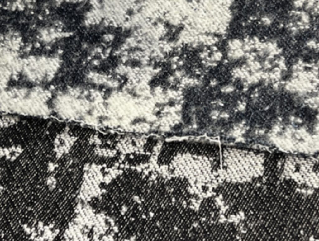Así como la arquitectura bogotana encuentra en el ladrillo un elemento modular que da forma al espacio, el denim se reinterpreta desde su materialidad y proceso de construcción. A partir de hilos recuperados de prendas en desuso, se desarrolla un no tejido con variaciones de textura patrón y color. La técnica parte de la descomposición del material para reconstruirlo como fieltro donde la combinación de diferentes calidades de fibra genera un textil con relieve, profundidad y un carácter completamente propio, este tejido se usará en partes focales de la prenda como parte de su narrativa.