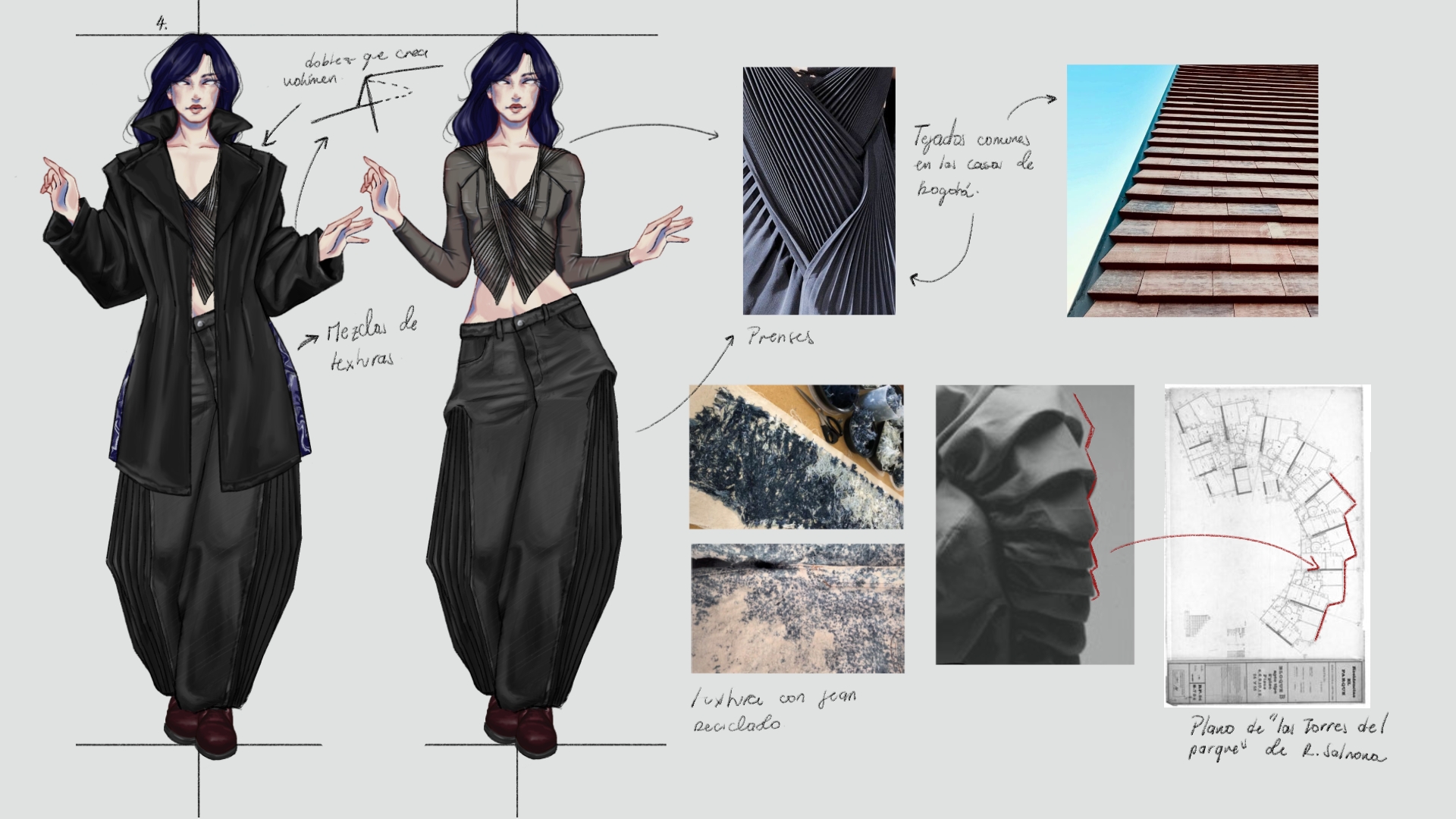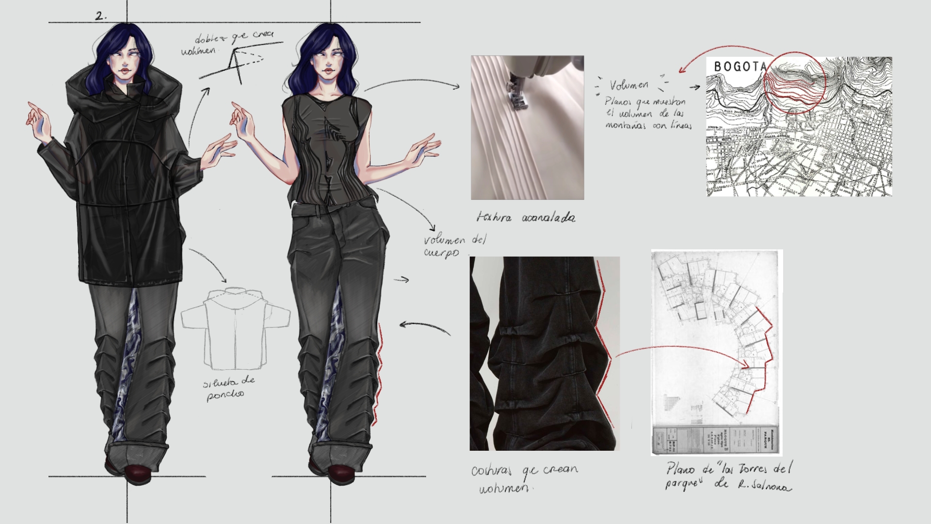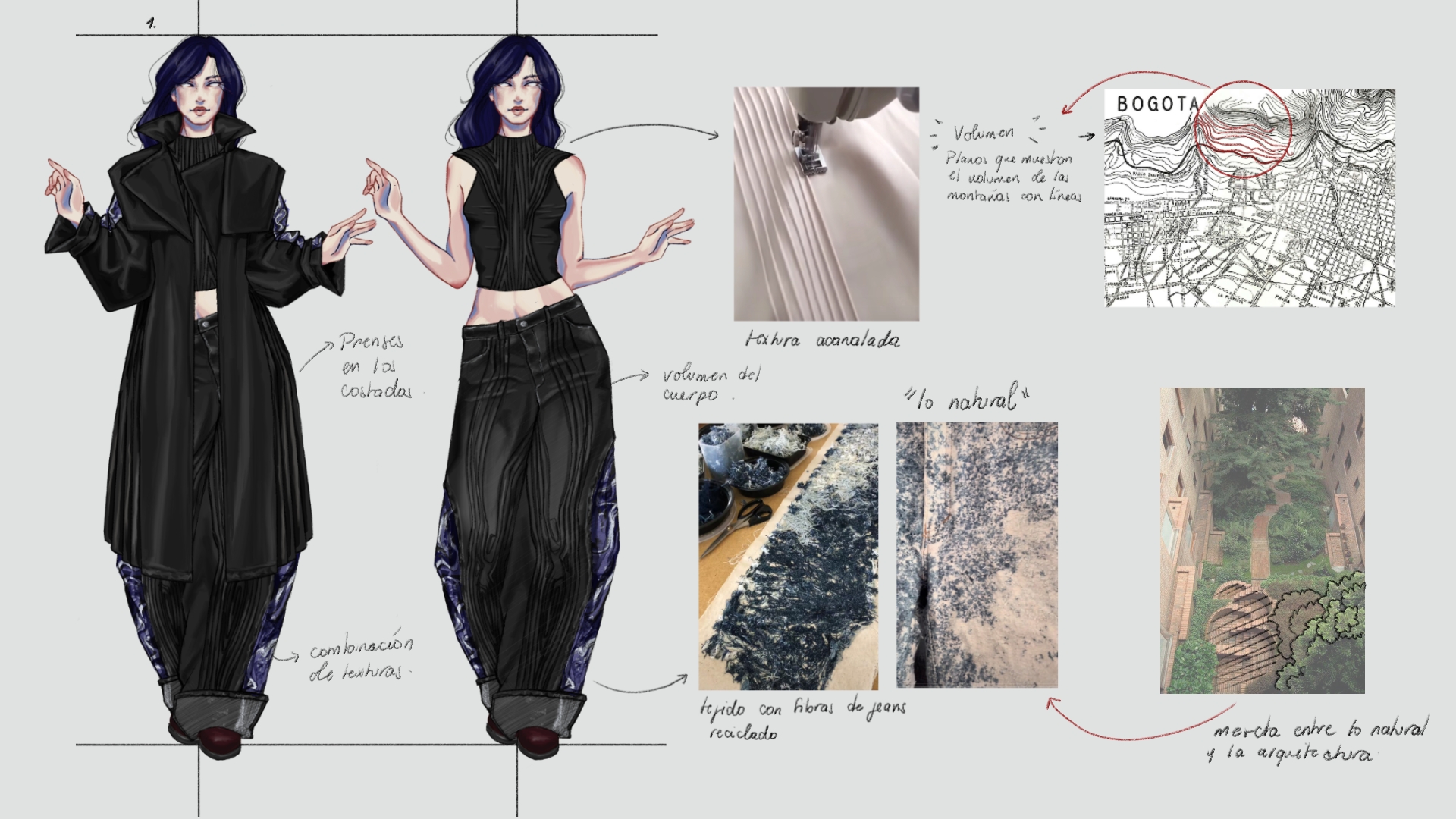 Esta colección parte de esa misma premisa: entender la ciudad a través de sus materiales, su geografía y su arquitectura. La propuesta se basa en una reinterpretación de la relación entre lo construido y lo natural, explorando la tensión entre rigidez y fluidez, estructura y movimiento, materialidad y funcionalidad. Así como el ladrillo en la obra de Salmona encuentra su valor en la forma en que habita el espacio, esta colección busca crear prendas que no solo vistan el cuerpo, sino que interactúen con el entorno, adaptándose a la cotidianidad de Bogotá y sus dinámicas cambiantes.